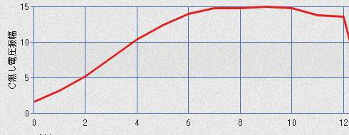 17%の帰還量で最大発振振幅となる。発振振幅の変化は差動ペアの電流特性に酷似しているようだが。  CV値が異なってもカーブの形は似たような変化であるが発振開始位置(回転角)が後の方に移動する。
