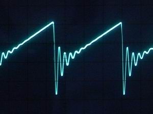 今度は低域の100Hz発振時振幅は1Vはあり、15KHz時の2.3Vと比べてもそこそこの振幅です。  振幅は非常に小さくなりますが、40Hzくらいまでは発振するようになりました。 これにより一般的な resonance波形がやっと出てくるようになりました。