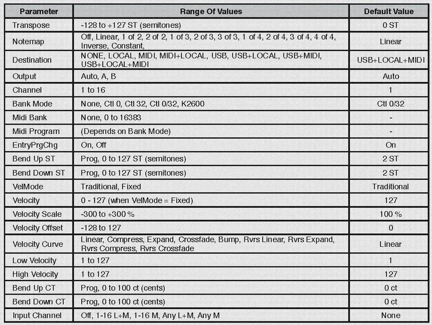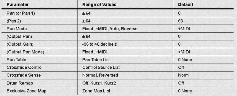** Programに共通の項目 ** 01:COMMON 01* Monophonic 02* LegatePlay ......... single trigger 03* Portament .......... monophonic時のみ有効。 04* PortamentRate ...... key/sec 05* AttackPortament .... legate portament ON/OFF 06* Globals ............ LFO2/ASR2/FUN2/4を globalにするかしないかの設定。 07* PitchBendRange Up 08* PitchBendRange Down 09* Output Gain 10* Category 11* Intonation Map 12* Intonation Key 13* Tuning Map 14* Out Pan 15* Out Pan Mode 16: Demosong ** ここから 1Layer要素 (Layerの数分これらのparameterが存在) ** ** Layer数=(1..32個) 02:LAYER (複数のlayerのdelay/選択/Bend、Pedalの反応の設定) 01* LoKey ................. Key Zone 02* HiKey 03* LowVelocity ........... Velocity Zone 04* Hivelocity 05* PitchBendMode ......... Sustain Pedal ON時の Bendのかかりの ON/OFF 06* DelayControllSource .. Voice delayにも matrix modulationがかけられる 07* MiniDelay 08* MaxDelay 09* LayerEnableSource ..... Layer muteに対しても matrix modulationがかけられる 10* EnableSense 11* OpaqueLayer 12* SustainPedal 13* SostenutePedal 14* Freeze Pedal 15* IgnoreRelease ......... Note off messageを無視 (trigger ドリブン..drum発音mode) 16* HoldThroughAttack ..... 17* HoldUntilSustain ......(<--) 17* Enable Low 18* Trigger 19* HoldUnitl Decay ..... 20* EnableHigh 02:ALGORITHM (DSP Block 組み合わせ構造) 01* Type 03:KEYMAP (sound blockと Key割り当ての関係の指定) 01* keymap .............. Keymapの選択(editを押すとkeymapの editができる) 02* Transpose ........... note位置とkeymapの対応がシフト 03* KeyTrack ........... これが一般synthの KeyTrack 04* VelocityTrack 05* TimbreShift ......... 06* AltAttackCtrl........ legate play時 PCM波形の読み出し開始positionを変更する。 07* PlayBackMode 08* StereoKeyMap 09* Alt Method 10* String Resonance 04:PITCH (一般的な synthの Oscillator modulationに相当) 01* CoasePitch ........... 静的pitch modulation 02* FinePitch ............ 同様 03* FineHz ............... 同様 04* KeyTrack ............. これはkeyに対応した静的pitch modulation 05* VelocityTrack K2000では上の KEYMAPのKeyTrackとの併用が可 06* PitchSource1 ......... matrix modulation 1 07* PitchDepth1 08* PitchSource2 09* DepthControllSource .. Source2は source2のdepthにも matrix modurationが可能 10* PitchMiniDepth ....... 開始値(Depth Controll0時の初期値) 11* PitchMaxDepth ....... Depth Controllの moduration幅(Controll max時の値) 05:DSP Control Parameter (F1/F2/F3 最大 4block使用可) 01* Coarse 02* Fine 03* KeyTrack 04* VeloTrack 05* Source1 06* Depth 07* source2 08* DepthControllSource 09* MinDepth 10* MaxDepth 11* DspFunctionType 06:AMP 01* Adjust(Coase) 02* Pad(Fine) 03* KeyTrack 04* VeloTrack 05* Source1 06* Depth 07* source2 08* DepthControllSource 09* MinDepth 10* MaxDepth 07:OUTPUT 01* Pair .................... out putの選択 A(FX)/B(DRY) 02* Pan A(FX)を選択しても Aにplugがささっていない時は 03* Mode MIX 端子に送られる 04* Gain 05* CrossfadeControllSource ...... Crossfadeにも matrix modulationが可能 06* CrossfadeSense