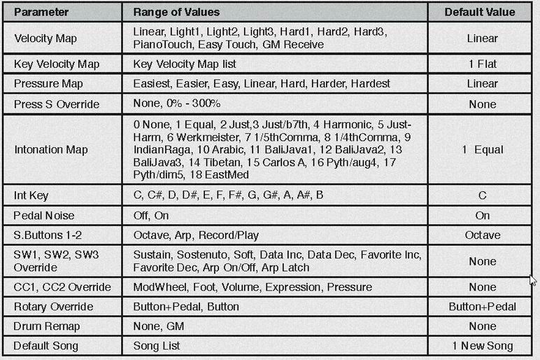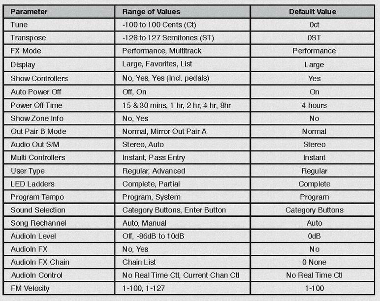 09:ENVELOPE(AMP_EG/EG2/EG3) 01* Natural/Edit(amp EG only) 02* AttackSegment1Time 03* AttackSegment2Time 04* AttackSegment3Time 05* AttackSegment1Level 06* AttackSegment2Level 07* AttackSegment3Level 08* DecaySegmentTime 09* DecaySegmentLevel 10* ReleaseSegment1Time 11* ReleaseSegment2Time 12* ReleaseSegment3Time 13* ReleaseSegment1Level 14* ReleaseSegment2Level 15* ReleaseSegment3Level 16* LoopType 17* #ofLoops ............... loop対象 segment指定 10:ENVELOPE CONTROLL(AMP EG) 01* AttackRateAdjust ........ 倍率調整 02* AttackRateKeyTrack 03* AttackRateVeloTrack 04* AttackRateModSource ..... Rateに対しても matrix moduation可 05* AttackRateModDepth 06* DecayRateAdjust 07* DecayRateKeyTrack 08* DecayRateVeloTrack 09* DecayRateModSource 10* DecayRateModDepth 11* ReleaseRateAdjust 12* ReleaseRateKeyTrack 13* ReleaseRateVeloTrack 14* ReleaseRateModSource 15* ReleaseRateModDepth 11:LFO(1/2) 01* LFO1MinRate ......... Rate初期値 02* LFO1MaxRate ......... Matrix modulation時の幅 03* LFO1RateModSource ... Matrix modulation 04* LFO1Shape ........... 26種 05* LFO1StartPhase ...... 位相 06* LFO2MinRate 07* LFO2MaxRate 08* LFO2RateModSource 09* LFO2Shape 10* LFO2StartPhase 12:ASR(1/2) ( Delay/Attack/Sustain+Release or Decay EG) 01* ASR1TriggerSource ...... Trigger SourceもMatrix modulationが指定できる 02* ASR1Mode ............... A/D repeatも可 03* ASR1Delay 04* ASR1AttackTime 05* ASR1ReleaseTime 06* ASR2TriggerSource 07* ASR2Mode 08* ASR2Delay 09* ASR2AttackTime 10* ASR2ReleaseTime 13:FUN(1/2/3/4) 01* FUN1InputA 02* FUN1InputB 03* FUN1FunctionType 04* FUN2InputA 05* FUN2InputB 06* FUN2FunctionType 07* FUN3InputA 08* FUN3InputB 09* FUN3FunctionType 10* FUN4InputA 11* FUN4InputB 12* FUN4FunctionType 14:VTRIGGER(1/2) 01* Vtrig1Level 02* Vtrig1sense 03* Vtrig2Level 04* Vtrig2sense