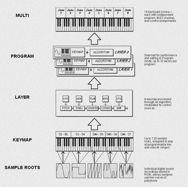 * 音色 PROGRAM構造 ・MULTI ......複数Channel(単独CHも可) ・PROGRAM.... 単独 Channel ・LAYER ..... Program内の element(1..32Max) MULTI