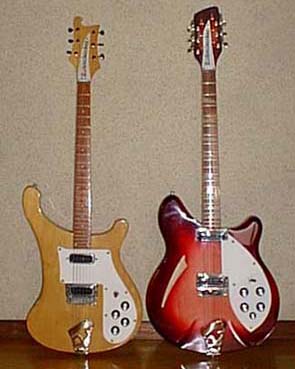 次の写真は左が73年から84年まで作られていた4000シリーズのベースと同じデザインのボディを持つ480で、リッケンには珍しい低コストですむボルト・オン・ネック仕様。