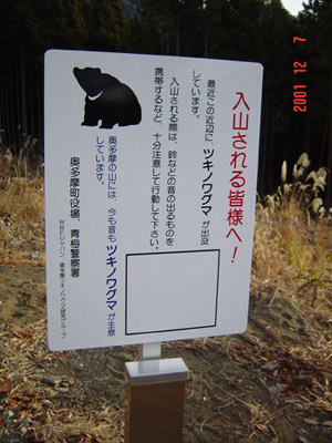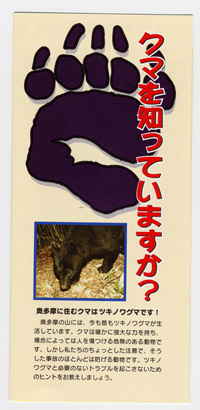 WWFJapanの助成を受け,クマとの無用なトラブルを避けるための看板とパンフレットを作製しました。パンフレットは奥多摩町役場,各ビジターセンターなどで希望者に配布する予定です。またご希望の方には,郵送もいたします。郵送希望の方は,パンフレット希望と明記の上,80円切手を貼った返信用封筒(定型角三)に宛名を記入したものを同封して,下記にお送り下さい。折り返し発送いたしますが,長期不在の場合もありますので,その節はしばらくお待ち下さい。お一人様一部とさせていただきます。