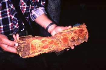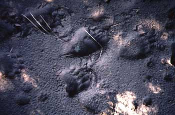 | Moguchi川岸辺につけられたヒグマの足跡 | キハダ樹皮につけられたヒグマの咬み跡 |