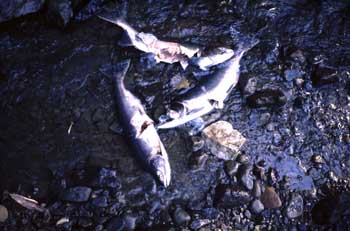 | Moguchi川でヒグマに腹を割かれたばかりのカラフトマス.ヒグマはイクラのみを摂食する | 野生動物保護局の森林官ミハイル氏 |