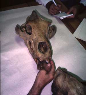 豊富に遡上するカラフトマスを主要なエサ食物としているために,平均体重は大きく,5〜6才での平均体重は250kgに達し,当才子でも夏には50kg前後になるそうです.野生動物保護局長のアレキサンドラ氏によると,内臓を抜いて450kgというオスグマを計ったことがあるそうです.また,メスの産子数が,他の地域に較べて多いようであるという話もしていました.これまでに60頭近くのヒグマを捕獲している,ウラジミール・マンデイサ氏は,3年間追い続けたあげく,1994年9月に,700kgのオスグマを仕留めたと話してくれました.実際にその頭骨を見せていただきましたが,700kgはともかく,ヒグマ博物館の前田氏の鑑定によれば,500kgはあるのではないかという大きなものでした.