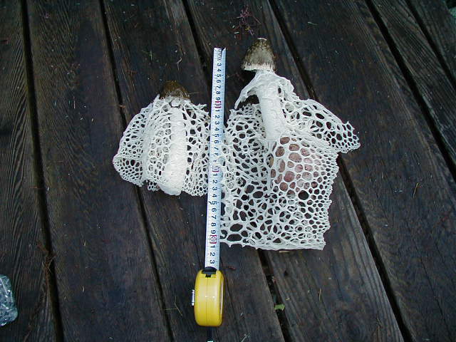 キヌガサタケって御存じですか?レースのドレスを着た人形、そんな格好をしているキノコです。戦後最大の台風か!?と騒がれた21号が関東に接近した翌日、近所の坂の掃除をしていた時に見つけました。食べられるの〜コレ・・・と思ったら食べられるようで、私が調理を命じられました。見た目からして中華だなコリャ、と思ったのでアッサリめの中華風スープにしてみたところ少量でも濃い出汁がでて、トロっとしたスープになりました。肝心のキノコの味はというと、なんというか今まで感じた事のないような不思議な食感でした。スルーっと喉を通ってあっという間に消えてしまいました。珍味というよりも、清涼感のあるキノコでした。