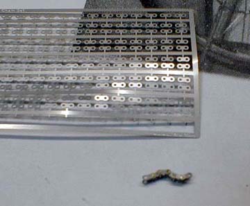 Basically, you sandwich two brass pipes with two PE parts to make one inner link. Then, use two more PE parts outside of it, and connect them with a pin cut from a brass rod. Hammering both ends of the brass rod will secure the assembly. |