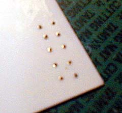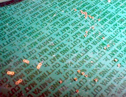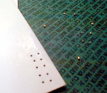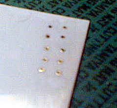 work so much easier. Stack plastic sheets to the desired pipe length, and drill holes to hold pipes of uneven lengths. Then file the pipes a little to level the cutting angle of all the pipes with the surface of the plastic. It's okay that a few pipes are still sticking out of the holes. Turn the plastic sheet over (with pipes still in place), and file the other side until all tips level with the plastic sheet. This will equalize the lengths of all pipes. See two pictures below. |