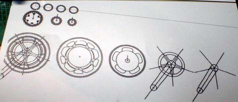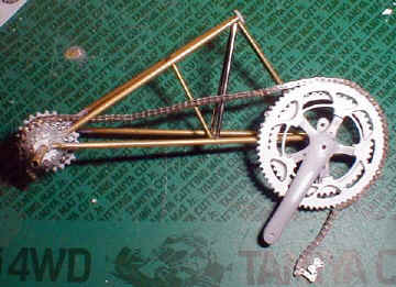 | Next parts were the crank assembly and sprocket. Ideally, sprockets should be photo etched for a sharper edge and ease of work. I know how to make custom photo etch parts, but I didn't have photo resistance film at the moment, so I employed more orthodox method instead. | |