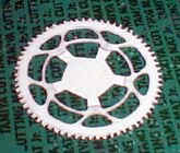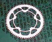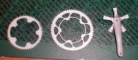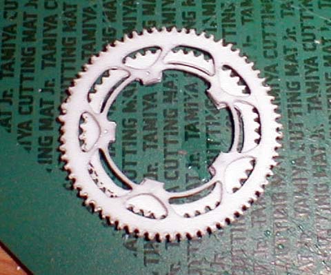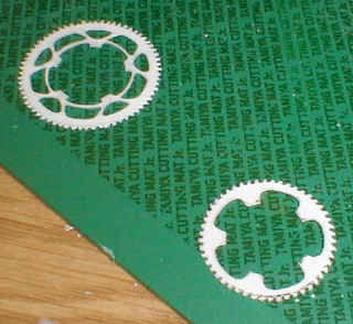 0.3 mm was not thick enough, so I glued the part to another sheet of plastic, and cut out the unnecessary areas. Finished sprockets are shown, one is outer and the other is inner. |