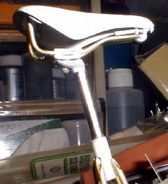 It was a little too hard to engrave the AM (Alex Moulton) logo on the seat directly, so I engraved it on a plastic paper, and I glued it on the top surface of the seat. Then, I sanded the surrounding area to bland it with the seat. |