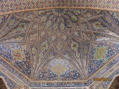 昼食後は市内観光へ。まずホテルの近くにあるクリ・アミール廟へ。ここはティムールをはじめ彼の息子たちが眠っている。廟の内部には棺らしきものがいくつも並んでいるが、遺体はこの棺には入っていなくて、地下に保存されているそうだ。廟の隣の地下にあるお土産屋さんを見る。ウズベク人のかぶっている帽子をかぶってみたが、すっぽりとかぶるのではなく、頭の上に載せて置くという感じでかぶるそうだ。