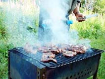 日光浴(日陰浴?)の後、近くの森でバーベキューをやった。組み立て式のバーベキューセットを取り出し、いつもの敷物を広げる。鉄でできたバーベキューセットに炭を入れ油をかけて火をつける。火が弱火になるまでカレイの干物でビールを飲んだ。カレイの干物は脂がのっていて、塩味がよくついていてビールのつまみにはもってこいだ。そのあと、豚のもも肉のかたまりをアンドレイがナイフで厚さ1センチくらいにに切り、私が塩を、妻がコショーを擦り込んで炭火で焼いた。こんがりときつね色に焼けた豚肉を食べながらウォッカを飲む。たくさんあった豚肉を4人で全部平らげてしまった。帰りはアンドレイの飲酒運転の車で帰った。