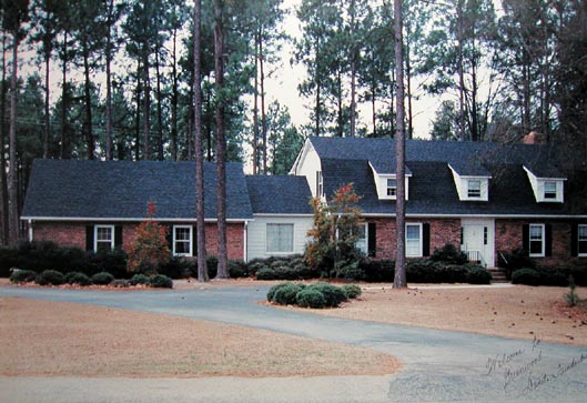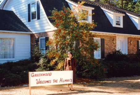 松かさは赤ん坊の頭ほどもある大きさでした ( 左上の写真は我が家と裏庭の松林 )。美しい小鳥達のさえずりが空から降りそそいできます。このような天下一品の野外コンサートは生まれてはじめての経験でした。 この季節はまさに小鳥たちの結婚のときだったのです。 後に友達とよく 「 まるで軽井沢にきたみたいね 」 と言い合ったものでした。 のちのち Greenwood の印象はとたずねられると 「 美しい小鳥達のさえずり 」 と答えるのが常でした。 みなさま、博学でいらっしゃるからご存じとおもいますが、さえずりと言う言葉は、 小鳥の雄と雌が互いにもとめ合うときの鳴き声のことなのだそうですね。 この時まで私は小鳥の鳴き声はみんな囀りだと思っていました。 さてびっくりしたことに、車から降り立つと、 庭先の GREENWOOD WELCOMES THE KUMAI'S. という立て札が私達の目に飛び込んできたのです。 Greenwood の人達の目一杯の歓迎の意が伝わってくるのでした。 そして、しばらくすると籠一杯のフライドチキンを抱えた男性一人と、大きなアイスティーのボトルをかかえた女性二人が、 These are Southern hospitality. とたずねてきてくれたのです。 私はすこし英語の勉強をしてきたし、挨拶ぐらいはおちゃのこさいさいのつもりでいたのに、 初めて英語を交わすアメリカ人に出会ったとたん How do you do ? が全くでてこず、 あわててその場で夫にたずねたことも忘れられないことの一つです。