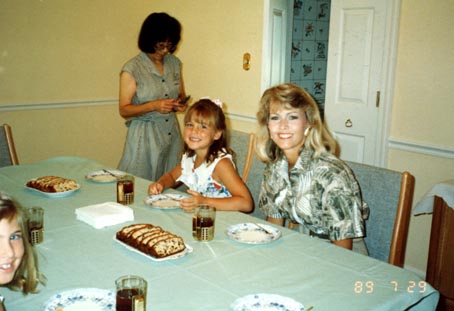 シュリンピングをしてきたからと、たくさんのえびをくださいました。このロックウエル家にはステイシー、アシュリーという二人のお嬢さんがいました。 二人とも、まだ小学生の低学年でしたが 「 まるで、人形のよう 」 などという言い方では、表現しきれないほどの可愛さでした。 下のお嬢さんはステイシーといって、私に出会うといつも 「 ミセスKumai 」 と声をかけてくれ、当時はやっていた、 ローラーブレードを得意げに、ひとすべり滑ってみせてくれたりしたものでした ( 写真:お礼に夫人と二人のお嬢さんを呼んで手造りのケーキを )。 この界隈の中流以上の人は、レイクのほとり、あるいは、ビーチ に、セカンドハウスを持つのが、一般的のようにみえました。 私達もよく色々な方々に彼らのセカンドハウスにお招きいただきました。 彼らは、たいてい、 底の平らなエンジン付きのポンチュウーンとよぶボートも持っていて Lake Greenwood の湖面を走るのを大きな楽しみにしているのです。 Lake Ggreenwood というのは、飲料、工業用、発電などの為に造られた、人造湖です。 その大きさは、 東京23区がすっぽりはいってしまうほどの広さです。