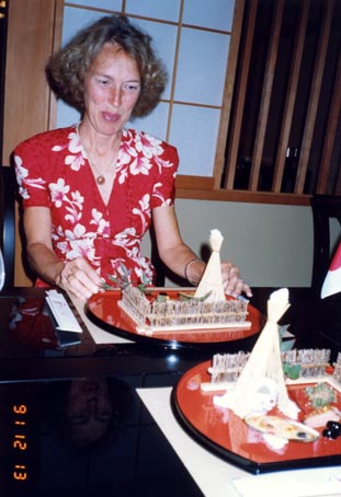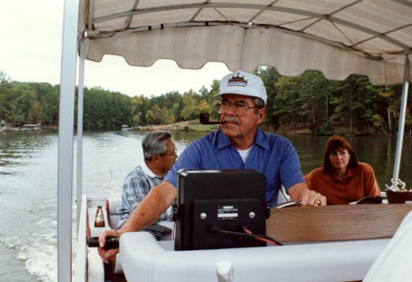 ( 左の写真:ペギー先生が日本食に挑戦 )。ペギー・アダムス先生が夏休みも終わりに近い8月の夕暮れ、 他の3人の先生方とその生徒達とその家族全員をレイクのほとりの家 ( セカンドハウス ) に招いてくださいました。夕飯をご馳走になりながら、みな、おぼつかない英語で先生方と話をし、 どうにも話が進まなくなると、コートニーさんに助け舟をだしてもらったりしながら、お互いに理解しようと努めました。 ロバーツ先生ご夫妻はポンチューンボートに私達をじゅんぐりにのせ、 湖上を遊覧させてくださいました ( 写真のパイプをくわえている紳士が夫の Roberts 氏 )。 いつも花柄ブラウスの、若くて綺麗な先生は、お医者様の奥様でアン先生でした。 もう一人は、 熟年の英文学を専攻なさった先生でした。 先生方はみな目一杯私達をもてなし、コミュニケーションをとろうとしてくださっているのがよくわかりました。 その日は、大変よい天気でした。天空に昇った月影がきらきらと、湖面の漣に映えるころ、私達は家路につきました。 ロバーツ先生ご夫妻は、英語を、教えてくださるだけでなく、民間外交官のように、 生徒の家族をことあるごとにご自分の家に招いて下さり、ご馳走しては、ボートに乗せてくださるのでした。 アダムズ家のレイクハウスのことについてですが、ゲイトをはいると、10万坪はあると思われる広い広い牧場です。 当時牛が30頭ほどいました。 紛れ込んできた野生の鹿や七面鳥も沢山いました。 車でゆっくり走るのですが、進路にたちはだっかって、