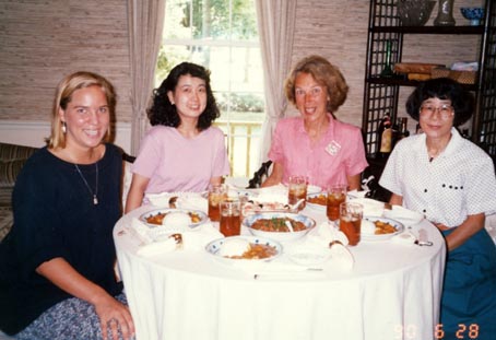 ありがたかったです ( 彼女は現在男児4人の母親です。 写真:左からコートニー、順子さん、ペギー先生、私 )。アメリカの夏休みは6、7、8月の半ばまでと、大変ながいので、その間、彼女が新任の日本婦人達の面倒をみたり、 英語を教えたりしてくれていました。 この婦人たちが、「 夏休み後もボランテイアで、英語を教えて欲しい 」 と希望をのべたところ、グリーンウッドの数人のアメリカ人婦人が、数年にわたって私達のわがままな要求にこたえてくださったのです。 当時ニューヨークでは、レッスン代が1時間あたり20ドルから25ドルもするといわれていました。 ですから、このことは、 大変にありがたいことでした。 頭のさがるおもいです。 当時私は、英語がわからなく、そのことで、頭が一杯でしたので、 この先生方の心のひろさに、あまり氣づかなかったのですが、いま、時間をおいて振り返ってみると、大変な事を、 よく引き受けてくださったものと、感謝の気持ちでいっぱいです。 その時の先生は全部で4人、生徒は、12〜14人ぐらいでした。 私の先生は、ペギー・アダムスさんときまりました。