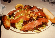 実はベルギー人の考え出したものだそうです。野菜不足も心配だとサラダの 「 小 」を頼むと、これが直径25cmの皿に山盛りで ( 写真はスモークド・サーモン サラダ )、 並みの日本女性ならこの美味しいサラダだけでも満腹になるのではと思うほどの量ですが、 更に気張って 1 リットルの大ジョッキのビールも取って、パン以外は結局全部奇麗に平らげます。 円高の現在とは言え、これで税サービスこみで ¥ 2,700(+チップ ¥140) だと言ったら、貴方は信じますか。 周りを見ると、女性でも、ビールはともかく、同じくらい食べた上に、 デザートには たまげるほど大きなアイスクリームまで食べています。 店の 紙のランチョン・マットに書かれた記述を読むと、 カタラン語なので全部は理解できませんでしたが、ビタミンやミネラルが豊富で、 クレオパトラやネロの妻ポペアも大量に食べたと有ります。 ともあれ、これを4日食べ続けたら、 私の体中に精気が漲ってきた事は事実です。 その代わり、 1kg体重が増えて 慌てました。 パエーリャや他の料理の話も、じっくりとしたいのですが、この辺で止めます。 5.英語の普及 30年近く前に欧州諸国を40日ほど業務出張で回ったときは、 北欧とオランダ、スイス以外は英語が通じなくて不便でしたが、今回はスペインやフランスでも、 ホテルや駅の従業員はもちろん、小さなレストランでさえ英語が通じました。 気付いた大きな差は、パリの街の店名、広告、看板などに、 英語の単語がはっきり増えていることでした。 欧州内を往き来する旅客機や国際列車内の放送だって、ほとんどは自国語の次に英語で、 それで終わりです。 もう、好き嫌いに関らず、英語は欧州の、いや、 世界の共通語になってしまったのだということを、痛切に感じました。 今後は英語を聞き取り、話せる能力がますます大切になることでしょう。 たとえば、 その能力の有無により、どこの国でも就職の機会が増減するであろうことは確実と思われます。 6.子供たちの底抜けの明るさ 週末の夕方にバルセローナに帰る電車に乗っていると、 田舎の駅ごとに中・高校生くらいの男女の10人から20人ほどの団体が次々に乗り込んできて、 いつの間にか社内は満員になりました。 大きなリュックと敷物を背負い、どこかでテントでも張って一泊してきた様子です。 先生かリーダーのような若い大人が数人いて、 彼等を中心に電車の中でまでキャンプソングや民謡を合唱し、 団体ゲームをして大声ではしゃいでいて、本当に楽しそうでした。 私も、若い頃はいろいろなグループで ああいう事をして青春を謳歌したものだったなと、 微笑ましくなる一方 「 最近はああいう若者の姿を日本ではあまり見ないな・・・。 今の日本の中・高校生たちは、もっと孤独で、ストレスの多い、 暗い時間しか持っていないのでは 」 と気になりました。 私の認識不足なら良いのですが・・・。 今回はこの程度で終わりにします。 7.落書き 日本でも道路沿いの壁や塀、橋などによく見かける、スプレイで描いた文字や絵の落書き・・・。 絵の方は 「 グラフィティ 」 と言うのだと、以前聞いたことが有るが、誰が何と言おうと、 承認された場所に描いたもの以外は 醜い 「 落書き 」 だ。 一夜明けたら自宅の壁や塀にあれを描かれていた人の怒りはどれほどか、想像にあまる。 文字の方は、あの文字だか記号だか知らないが、一種独特な形の落書きは、万国共通書体 ? らしく、米国でも、 今回訪れたフランスやスペインでも、私には日本で見るものと区別がつかないほど似ていた。 とにかく、街中に氾濫と言うほどではないが、随所にたくさん見られた。 カタルーニャの古い田舎町に在る、ガイドブックにも載っている有名な歴史的建造物を尋ねあて、 写真を撮ろうとしたら、壁面や石垣にあれがあって、一瞬シャッターを押すのをひるみ、 それから猛然と腹が立った。 日本で言えば重文・国宝級のこの美しい建物の壁に、何故コソコソとこんな醜い落書きをするのか。 この犯人たちは人間の外観を持ってはいるが 「 人の心 」 を持っていない 畜生か悪魔なのではないかとさえ思った。 そのうちに 「 この建物はキリスト教 ( カトリック ) の寺院だ。すると、 犯人は或いはこれと敵対し憎悪しあっている別の宗教や宗派の狂信者たちなのか。それとも、 社会的に虐げられ恨みが煮えたぎっている、外国から出稼ぎに来た途上国の人たちなのか 」 と、 フッと考えたりもした。 日本でも、私は 「 これは中近東か中南米出身の不良外国人たちあたりの 夜陰に紛れての 鬱憤晴らしだろう 」 と想像したりしたこともある。 「 日本人なら、訴えたい主張は日本語で書くだろう。 あんな得体の知れない文字 ? を書くのは外人に決まっている 」 と単純に考えたのだ。 どんな連中がいつ ( 深夜? ) 描くのか、今まで全く分からなかったので不気味でもあったが、 今回スペインで、日中、線路際の倉庫の壁にスプレイしている2人の若
