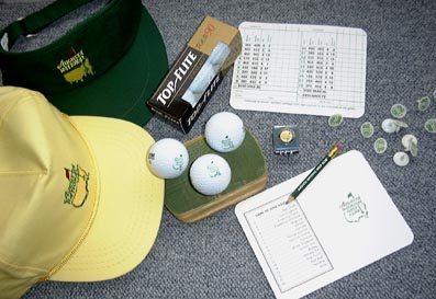 中には何着も吊るしてある複数回優勝者もいました。最後が、何を隠そう、実は私が一番期待していたプロショップの売店です。 シャツ、帽子、 ロゴ入りボールを始め、もう見境いもなく何でも買いまくりました。 使い道がないことにも気づかず、ピンの先につける黄色い旗まで買いました。 マスターズ・トーナメントの時にコースの一角に開かれている売店も大変な賑わいで、あそこで買えるグッズも貴重品ですが、 あれには 「 Masters 」 という文字が入っているのに対し、このクラブハウスで売られている品には、 形や色は同じでも 「 Augusta National Golf Club 」 と書いてあります。 更にはるかに貴重品で、 米人ゴルファーたちの間でも垂涎の的です。 このコースでプレイできる稀有の果報者だけが買える品だからです。 最後に、スコアカード数枚と鉛筆を記念にとそっとポケットに押し込んだら、親切な父上が、 プラスチックのグリ−ンマーカーを大きな手で一掴み 「 持って帰りな 」 と呉れました。 夢のような1日でした。 自分の運転だったら、帰りに事故を起こしていたかも知れません。 翌日 「 一体一人いくらなんだろうね 」 と会社で物知りの米人に聞いたら 「 まあ$300かな 」 という返事でした。 当時、米国南部のこの付近では普通のコースでビジターが1ラウンド$20から$30、 日本でも名を知られた名門コースですら、せいぜい$100だったのですが・・・。 では最後にその記念の品々の一部をお目に掛けましょう。 ![]() (*) :このクラブは、年1回のマスターズで相当の収入を挙げられることもあり、 客の払うプレイの費用などは最初から全く当てにしていないように見えます。 毎年の年会費は、その年の収支の不足分を200余人のメンバー数で割り、 請求するだけとも聞きました。 ハリケーンの被害のあった年などは高額になりますが、 それが嫌だったり、払えなかったりするような人は、そもそも会員になる資格がないのだそうです。 そういえば、私は、「 接待 」 でタダでプレイをしたのでした。 勿論、後日、それなりのお礼の品を差し上げましたが。 参考:各ホールには、そこに植えてある美しい花を咲かせる樹々の名前が付けられています。(Wikipediaより) 1番ホール:ティー・オリーブ(Tea Olive)、パー4、455ヤード 2番ホール:ピンク・ドッグウッド(Pink Dogwood - 桃色のハナミズキ)、パー5、575ヤード 3番ホール:フラワーリング・ピーチ(Flowering Peach - 桃の花)、パー4、350ヤード 4番ホール:フラワーリング・クラブ・アップル(Flowering Crab Apple - 野生のリンゴの花)、パー3、240ヤード 5番ホール:マグノリア(Magnolia)、パー4、455ヤード 6番ホール:ジュニパー(Juniper)、パー3、180ヤード 7番ホール:パンパス(Pampas)、パー4、450ヤード 8番ホール:イエロー・ジャスミン(Yellow Jasmine)、パー5、570ヤード 9番ホール:カロライナ・チェリー(Carolina Cherry)、パー4、460ヤード 10番ホール:カメリア(Camellia)、パー4、495ヤード [11番から13番までが「アーメン・コーナー」と呼ばれる] 11番ホール:ホワイト・ドッグウッド(White Dogwood - 白いハナミズキ)、パー4、505ヤード 12番ホール:ゴールデン・ベル(Golden Bell)、パー3、155ヤード 13番ホール:アザレア(Azalea)、パー5、510ヤード 14番ホール:チャイニーズ・ファー(Chinese Fir)、パー4、440ヤード 15番ホール:フィレットホーン(Firethorn)、パー5、530ヤード 16番ホール:レッドバッド(Redbud)、パー3、170ヤード 17番ホール:ナンディナ(Nandina)、パー4、440ヤード 18番ホール:ホーリー(Holly)、パー4、465ヤード |