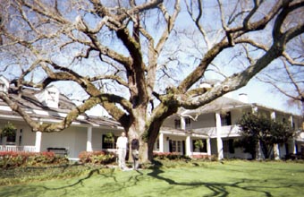 大きな樫の樹の後ろにあるこの簡素な平屋のクラブハウスとその前庭には、トーナメント中でも
