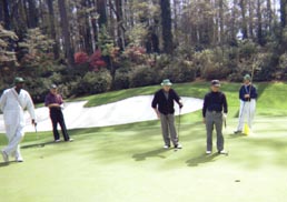 でプレーをしたというお話です。あの世界一の名門コースでプレイするという稀有の幸運に恵まれた日本人が、 一体今までに何人いるでしょう。 毎年1回、4月上旬に開かれるマスターズ・トーナメントを観戦するために、 最近20年ほどは毎年おそらく千人以上の日本人が殺到していると思われるので、 コースを見、歩いた人は、累計数万人に達することでしょう。 しかし、実際にプレイをした人となると、栄えある招待を受けたプロを含めても、おそらく数百人、 程度と推測します。 あのジャック・ニクラウスでさえ、ある日、立ち寄って 「 プレイさせてくれ 」 と頼んだら、 見事に断られたというこの名門コースには、次のいくつかの理由により、 ビジターのプレイを厳しく拒んでいるのです。 これに比べたら、 同じ米国の有名コースでも、ベブルビーチやパインハーストなどは、来客を増やしたいので、 金さえ出せば誰でもラウンドできます(*)。 ( うまく言えないのですが、今の日本にも 「 金を幾ら積んでも、売ってくれない物、入れてもらえない会、やらせてもらえない遊び 」 などがあってよいのではと私は思います。 そうすれば、人は 「 財力以外にも人間の評価基準がある 」 ことを、もっと強く意識することでしょう。 今の日本は金だけが万能でありすぎます ) 1.メンバーは米国を中心に選ばれた特別の200人ほどしかいない。 名簿すら公表されない。 2.通常は4名中メンバー2人以上、ビジター2人以下でしかプレイさせない。つまり、 あるビジターがプレイしようとしたら、2人の同伴メンバーを探さないとならない。 3.1年の半分ほどをクローズしてコースの整備に充てている。 1996年3月のある日、私の家 ( 敷地が1,300坪あった ) の庭の芝生に自動散水設備を作らせたり、 年に30回芝を刈る仕事を委託したりしていた造園会社の若社長から 「 私の父はこのサウス・カロライナ州に4人しかいないメンバーの一人だ。たまたま、 同伴メンバーが1人、ビジター3人でよいという日があるから、プレイに招待したい 」 という、驚くべき申し出を受けました。 勿論、断るはずがなく、休暇を取って出掛けたのは、 4月2日の火曜日、何と、その年のマスターズ開催の前の週でした。 という事は、コースの状態が1年の中で最高の瞬間だったということです。 彼と彼の父上、それに声を掛けたら二つ返事どころか四つ返事で参加したW君との4人で、 快晴に恵まれ、アゼリアやドッグウッドが咲き始めた暖かい春の1日、 ほとんど誰もほかにプレイしていないこの美しいコースで過した夢のような半日について語りましょう。 ジョージャ州オーガスタから車で70分の所に住んでいた私には、 マスターズの練習ラウンドや本トーナメントの観戦の入場パスを、毎年、 町の有力者たちが貸してくれました。 ですからその時までに既に6回ほどコースの中でゆっくり1日中観戦しており、 コース自体は、もう見ても感激することはありません。 目をつぶれば、18ホールすべてを瞼の裏に順に描くことも出来ました。 しかし、 この1日は、一体自分はどうやって過したのか、あまりにアガっていて、 当日の写真やスコアカードを見直さないと、何も思い出せないほどでした。 とにかく、大変な興奮状態でした。 我々の車は警護厳重な門を父上の顔パスで滑るように入りました。 立派な更衣室で着替えた後、先ず練習場に行くと、ボールは真新しいのが100個くらい、 見事なピラミッド状に各打席の横に積み上げられています。 これを恐る恐る1個づつ取って、 打っているうちに、だんだん気持が落ち着いてきました。 コースに出ようとすると、何と、