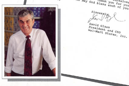 WAL−MART ( ウォールマート。 ロゴは WAL★MART 。 正式には Wal-Mart Stores, Inc. ) という小売業で世界最大の会社をご存知と思います。 経営難に遭遇している西友と数年前から組んで、日本にも進出してきていますね。 この会社については、私には忘れられない一つの思い出があります。 1988年、私が米国南部の小さな州サウスカロライナの、そのまた小さなグリーンウッドという町に、 富士フイルムの米国工場を建設するために移住していったとき、この町には、ライバルの K-Mart も含め、 ローカル資本のスーパーマーケットが幾つかありましたが、 この全米一、いや世界一の巨大スーパー Wal-Mart の店は、まだありませんでした。 その後数年して、このスーパーがこの町にも進出して来て、巨大な店舗を構えたとき(*1)には、 町中に大きな衝撃が走り、いくつかの既存のスーパーが、その後次第に消えて行きました。 この強者 Wal-Mart に興味を持った私は、当時いろいろと調べてみましたが、この会社は、 これも米国の南部にある小さな州アーカンソー( クリントン元大統領の出身州 ) の、 しかも西北の一番隅っこに在るベントンヴィル ( Bentonville ) という、 大きな米国の州別の地図を虫眼鏡で探さないと見つからないような小さな田舎町で、創始者 サム・ウォルトン ( Sam Walton ) が、 1962年に、最初の小さな安売り店を開いた時から始まりました。 当時彼は44歳だったといいます。 彼は 「 我々はより安く売る ( We Sell For Less ) 」 と 「 満足を保証します ( Satisfaction Guaranteed ) 」 の二つのモットーを店に掲げ、このディスカウントストアの店舗数を全米の中小都市(*2)を中心に次々に拡大して行きました。 そして、1991年には、ついに売り上げ世界一の小売業の地位を獲得し、 その翌年、彼はがんのため病死しました。 というわけで、私が Wal-Mart の存在を知り、興味を持ったのは、彼の死の直前だったことになります。 なお、この会社がその後も大きくなり続け、2003年には、 世界のすべての企業の中で最大の売り上げ高を記録したということはご承知の方も多いと思います。 サム・ウォルトンについての逸話を、当時、米人たちからいろいろ聞かされました。 彼の会社の本社は、 すでに米国有数の巨大企業になっていた当時も、上記の田舎町にあり、たしか、木造2階建てのオンボロ社屋で、サムは、 質素な身なりに野球帽をかぶり、ピックアップトラックを自分で運転して、毎日出社していたと言います。 誰しも舌を巻くに相違ない、徹底したケチケチの堅実ぶりです。(*3) 彼は、生前、身内からではなく、部下の一人を後継の社長兼CEOに選びました。 それが、私がこれからお話しするデイヴィッド・グラス ( David Glass ) 氏でした。 イーストマン・コダック社のダンピング提訴により、日本の企業が日本製のカラー印画紙を米国に輸出できなくなったのは、 1993年から94年にかけてのことでした。 これに対処するため、私が経営の任に当たっていた富士フイルムの米国生産拠点では、急遽カラー印画紙を生産することになり、 そのための巨大工場の新設計画がスタートしました。 常識的にはすくなくとも3〜4年はかかると、 社内外の誰しもが考えていた 「 建設構想→工場設計→設備設計・製作・据付→試運転→生産開始というステップを、 たった2年でやってのける 」 という計画を決定し、社外発表を94年の2月に行いました。 しかも、多数の米人技術者や作業者の新採用、教育、訓練と共に、数多くの特殊な独自の原材料を合成してくれる日本以外の国の会社の選定、 合成法の伝授と新規生産体制確立、質と量の安定供給の確認、各素材の安全性許可の取得、 などの数多くの課題も、非常に時間を食う仕事でしたが、これらも並行して乗り越える必要がありました。 日本製の原材料を一つでも使ったら、この場合 Made in U.S.A. と製品に書けないからです。 Made in U.S.A. なら、幾らで売ろうとダンピングだなどと難癖をつけられる筋合いはありません。 2年後の1996年春までに 「 米国製 」 の製品が供給開始できるなら、 当時販売部門が抱えていた全米各地で働いている多数の米人セールスマンたちを雇い続けたまま、 欧州の某社から購入したカラー印画紙を ( 損益を度外視して ) 売らせて、 それまで獲得していた多くの大口の顧客たちをつなぎとめておくことができるという考えでした。 それ以上時間がかかるようなら、 もう市場からは相手にされなくなり、米国でのこのカラー印画紙のビジネスからは撤退するほかないという、まさに背水の陣でした。 のべ数百人に及ぶ日本人チームの一人一人は、今考えても本当に素晴らしい専門家たちでした。 米人たちも、 本当に真剣に働き、習熟に努めてくれました。 彼らの献身的なの努力と協力のお蔭で、 業界の常識では不可能としか思えなかったあの計画より、更に1カ月早く生産を開始することが出来たのでした。 さて、この巨大な米国カラー印画紙工場から生産される ( 今まで、日本