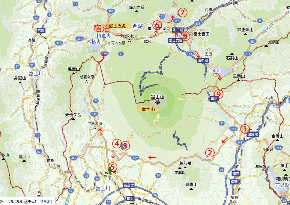 「 富士山すそ野グルリ一周ウォーク 」というのがあったので、それに参加しようかなと思い、検討してみました。すると、順序は任意ですが全部で17回に分けて歩くのだそうで、真夏や真冬を避けて月に1回か2回のペースで参加していたら、歩き終わるまでに2年くらいかかってしまいます。 自分の年齢を考えたら、これは無理です。 では自分一人で歩いたらどうかと考えましたが、自分の車でこの地域まで行くとなれば、歩いた後で、また車を駐車しておいた元の地点まで戻らなくては家に帰れません。 公共交通機関はどうかというと、自宅からこの一周のコースの付近にかけては、鉄道や路線バスがほとんど走っていませんから、これらを使って往復することも出来ません。 そこで仕方なく、一泊2日で車で一周してみようと考えました。 あちこち寄り道せず一周だけなら約120kmで、若い人なら1日で回れるのだそうですが、私たちは、ゆっくりと一泊2日で回ることにしました。 とは言え、ただぐるりと一周ドライブするだけでは能がありません。 そこで、富士山の周囲に沢山ある 浅間 ( せんげん ) 神社 のうち、主なものだけでも順に訪ねてお参りしようと考えつきました。 浅間神社とは、富士信仰に基づいて 富士山を神格化した浅間大神 ( 浅間神 )、 または浅間神を記紀神話に現れる木花咲耶姫命(このはなのさくやひめのみこと)と見てこれを祀る神社だそうで、北海道から広島にかけて全国には約1300社もあるとのことです。* 当然のことですが、その多くは静岡、山梨およびその近県に散在しており、静岡県富士宮市の富士山本宮浅間大社が総本宮とされています。 富士山には、古来いくつもの登山道がありますが、 各登山道の登り口にはそれぞれ浅間神社があって、登山者はまずそこに参拝し無事安全を祈ってから登山をしたと言われています ( 下記 )。 もちろん、富士山の頂上にも浅間神社はあります ( 富士山頂上浅間大社奥宮 )。 表口 ( 富士宮口 ) :富士山本宮浅間大社 村山口:富士根本宮村山浅間神社 南口 ( 須山口 ) :須山浅間神社 御殿場口:新橋浅間神社 東口 ( 須走口 ) :東口本宮冨士浅間神社 北口 ( 吉田口 ) :北口本宮冨士浅間神社 富士山は西の富士宮口が正面 ( 表口 ) だったと、今回初めて知りました。 頂上の 「 富士山頂上浅間大社奥宮 」 も、富士宮口から登りきったところに在るようです ( 東口、北口などからの登山道の頂上には、 奥宮の末社の富士山頂上久須志神社というのが在るとのこと )。 いろいろと調べた末、私は、次の9つを選んで、この順に ( 時計回りに ) 参詣しながら富士山を一周ドライブすることにしました。 ![]() A 静岡県裾野市 須山浅間神社 B 静岡県富士宮市 山宮浅間神社 C 静岡県富士宮市 富士根本宮村山浅間神社 D 静岡県富士宮市 富士山本宮浅間大社 E 山梨県富士河口湖町 富士御室浅間神社 F 山梨県富士河口湖町 河口浅間神社 G 山梨県富士吉田市 北口本宮富士浅間神社 H 静岡県駿東郡小山町 東口本宮富士浅間神社 出かけたのは11月9〜10日で、ちょうど紅葉が見ごろの頃で、ことに山梨県内では神社の境内などで美しい紅葉が見られました。 各神社では参拝するだけではなく、 朱印帳を持参して記帳していただきました ( 40年ほど前に多くの社寺の朱印を集めていた当時は、どこの社寺のものも流れるような、美しい筆跡でしたが、今回は残念ながらそういうのにはお目にかかれませんでした。 政治家でもTVに出てくる評論家でも、以前は多くの人が達筆でしたが、現在はそういう人に殆どお目にかかりません )。 総走行距離は自宅から出発 ( =終着 ) 点まで往復する距離を加算すると丁度200kmでした。 夫婦が8:2くらいの比率で運転しましたが、合計167歳の老夫婦にとって、 半分以上は初めての不慣れな道 ( しかも、なぜかあちこちが工事中で迂回させられた ) を一日100km走るのは、やはりちょっと無理だったようで、帰宅後は二人とも数日間グッタリと疲れました。 たぶんもう二度とこの種の過激なことはしないでしょう。 なお、参詣その他に要した一日の歩行距離は5000歩 ほどでした。 左上の写真は、巨木に囲まれて静かな森の奥にひっそりと佇むAの須山浅間神社です。 ![]() *:富士山は古くは 「 福慈神 」、「 不尽神 」 などと記載されるような霊妙な神山・日本鎮護の神山であったが、奈良時代末から火山活動が活発化し、火山神 ( 浅間神 ) としての信仰 ( 浅間信仰 ) が全国に広がった。 「 浅間 ( あさま ) 」 の語源については諸説あるが、長野県の浅間山のように火山を意味するとされる。 「 あさま 」 は古称で、「 せんげん 」 は中世以降から用いられたとされる。 ( Wikipediaから抜粋させて頂いた ) |