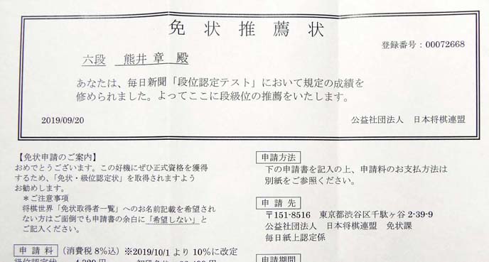 今般、私は社団法人日本将棋連盟から六段の推薦状を頂きました。