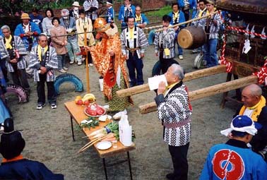 などという不似合いな役目を担当し、終日 「 はっぴ 」 姿で、地方都市に何百年も伝わる伝統行事の一翼を担った ( 写真中央が私 )。