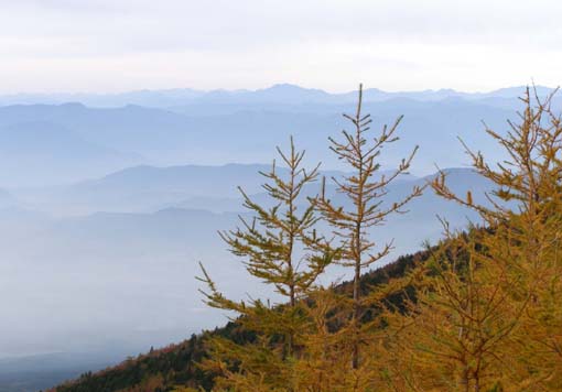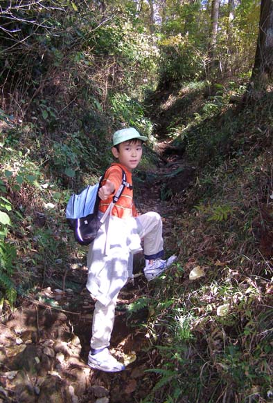 10月8日の夜明け直前のことでした。 この山は、箱根の外輪山に隣接する矢倉岳 ( 標高870m ) です。いきなり余談となりますが、ここに載せるためにピクセルを落したこの画面では、たとえ拡大しても見えませんが、 三脚を用い、セルフタイマーで撮ったこの望遠写真の原画には、直線距離で5.5km離れたこの山の尾根に並ぶ木々の一本一本がハッキリと写っています。 最近のデジカメの性能の向上には驚くばかりです。 12月初旬の土曜の朝、お天気が良いので、9歳の孫と二人でこの矢倉岳に登りました。 見かけはなだらかですが、 始めのうちゆるやかでも、登り始める次第に険しくなり、一番急な所では30度以上もあるのではと思うほどの急坂を、 喘ぎながら登りました。 古い日記を調べると、97年の5月11日 ( ということは、ちょうど9年半前、私は64歳でした )、 カホルと二人で登った時は、麓から頂上まで、他のハイカーたちをグングン追い越しながら、二人とも一度も休憩を取らずに、 1時間ほどで一気に登ったと記してありました。 ところが、今回は1時間40分を要し、最後の3分の1ほどは、 いくら急坂とは言え50歩ごとくらいに立ち止まっては孫を待たせて一息入れないと、苦しくて仕方がないという 「 ていたらく 」 でした。 以前にも書きましたが、私の年代での10年間の体力の衰えは、こうして同一条件で比較すると、本当に冷酷な現実となって理解されるのです。