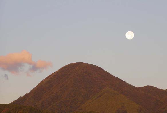 翌朝早く起き、西の山かげに沈みかける有明の月を、朝焼けの雲や紅葉の始まった山肌と共に2階の窓からカメラに収めたのは