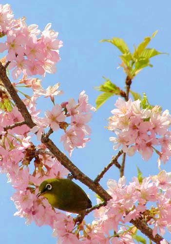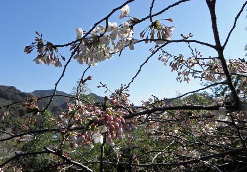 近くの山腹に咲く河津桜の花も中旬には満開となり、メジロその他の鳥たちもいっぱい集まってきます ( 写真右 )。