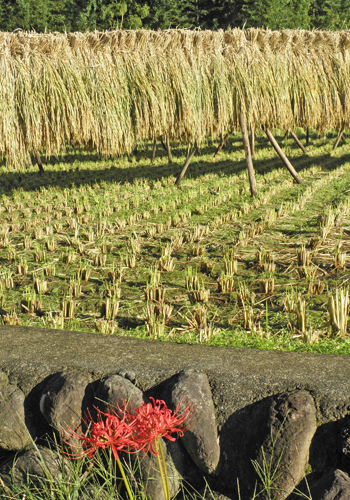9月の下旬には、自宅付近の水田では殆どが稲刈りを終えました。 刈り取った稲穂を 「 はざ 」 にかけで乾燥する農家は年ごとに減り、稲刈りと同時に脱穀してしまう農機が