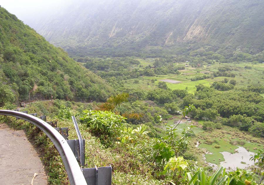 ハワイの島々のうち、一番大きなハワイ島は面積が日本の四国の56%近くもある大きな島で、富士山より高い4000m級の高山もいくつもあります。 その北東部にあるワイピオ渓谷は、陸路からも海からも入って行くことは非常に難しく、いまだに観光客はめったに訪れない秘境です。 1回目のハワイ島訪問の際にヘリコプターツアーに参加し上空から見たその圧倒的な景観に感激し、いつかは訪れたいと願っていました。 今回3度目の訪問で、ようやくその願いがかないました。 地元在住の友人 ( 米人 ) の運転する大型の4輪駆動車が、細心の注意を払ってソロソロと、たった1本の30度近い急勾配の細い坂道を下ってゆきます。 優先権のある下から上ってくる車に道を譲るために、急坂をバックで戻り車を右の崖際に寄せるときなどは、右側のガードレールとの隙間は4インチ (10cm ) くらいです。 心臓が凍る思いの助手席の私が崖側の窓から首を出して 「 あと6インチ! あと4インチ! 」 と叫ぶと、何度も来たことのある上手な運転者も思わず声が荒くなるほどの緊張感です。 今回はそんな事はありませんでしたが、止まった四駆車がブレーキをいっぱいに踏んでもズルズルと滑って下がっていったと、翌日会った別の人は言っていました。 10分以上もかかってようやく下に降りた車は、過去に坂道から転落した車の残骸を横目に、今度は車腹をこするような猛烈なデコボコの悪路を数百m走り、やっとのことで絶景の海岸に達します。 次に深さ50cmくらいの川を何回もジャブジャブと渡り、渓谷を遡って行くと、次々に絶景が現れ、右側の垂直の絶壁にはヒイラヴェ滝をはじめとする高さ300m以上もの滝が何本も見えます ( 今回は異常乾燥で滝の水量は少なく、写真に写らなかった )。 観光後ふたたび急坂を登って上に戻った時はようやくホッとしました。