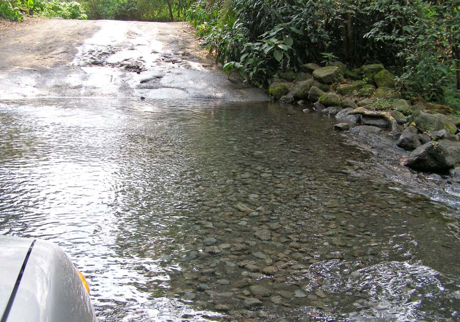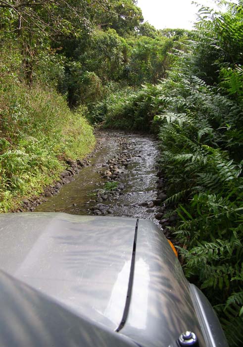 道は狭く、何度も小川を横切って車を前に進める。 ここから先はすれ違える路幅はめったにないが、幸いほとんど車は来ない ( 左下が車の先端 )。