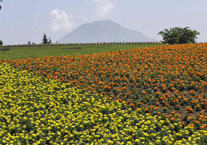 花畑の向こうに伯耆大山の頂上付近を望む。 鳥取花回廊にて