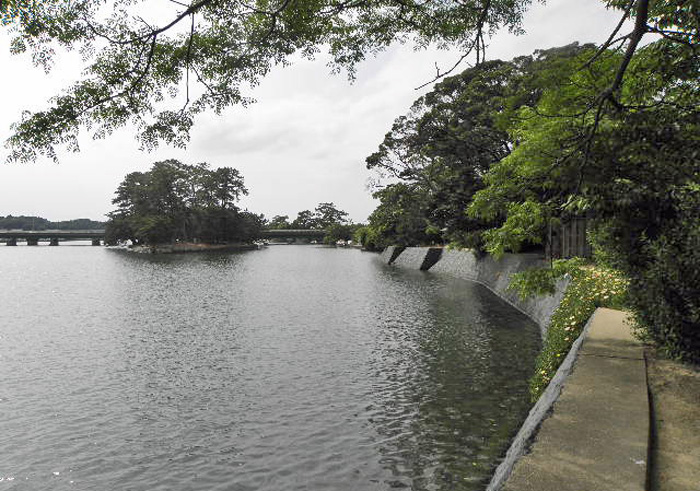 萩市の武家屋敷の一つ 「 口羽家住宅 」 の庭先で橋本川河口から日本海方面を望む
