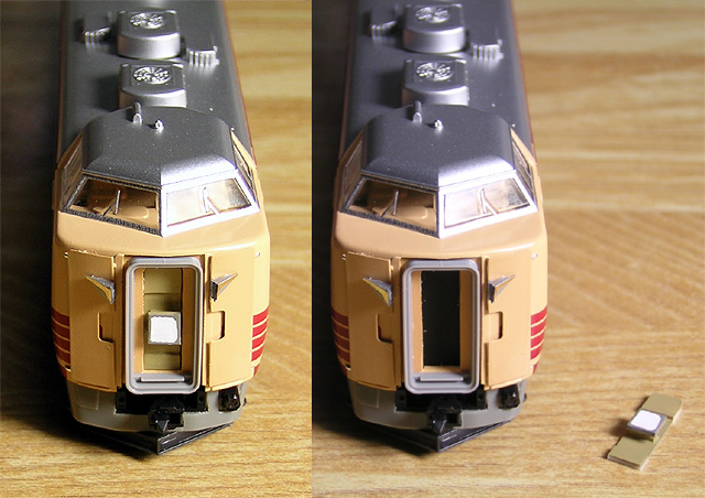 ・貫通扉 タヴァサの381系用貫通扉を左右分割した上、塗装。GMクリーム4号に赤と黄を少量加えたもの。