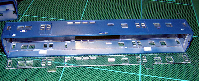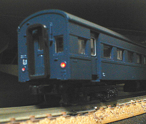 | スユニ50 | CP | KATO EF66用レンズとLEDでテールライト点灯化。 青はモリタを使用しましたが、なかなか良い色合いです。 そのまま組み立てるとGM客車標準の車高になるので、床板止めを加工し、KATOに合わせて1mm下げています。 |