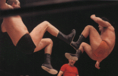 若く荒っぽいテリーがラッシュしてテキサススープレックス(人間風車)で先取。波に乗るテリーを冷静に受け流し、リバーススープレックスで切り返してタイに。最後はテリーが反則暴走した。