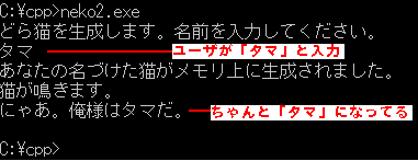 上の例では、Nekoとして「ボス」という名前を持つdoraを生成しましたが、ユーザが名前を決めることもできます。たとえば、neko.cppのmainを次のように書き換えることもできます。