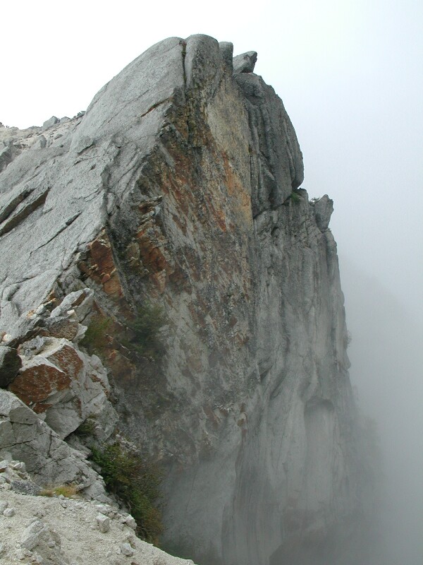 私は30年近くも以前のニッカーホースをはいている。これが実に具合がよいのだが、現在ははいている人はまず見かけない。甲斐駒から麻利支天へゆこうとして、ルートを誤った。写真右上から下って来て一般道に合流。別に危険ではなかったが時間的にはロスした。他の登山客が数名ついてきたので私の責任重大。 麻利支天の手前のコルにて。赤石沢へ落ち込む大岩壁。赤石沢はロッククライミングのメッカだ。 甲斐駒ヶ岳の帰路。双子山(2,649m)から駒ヶ岳を望む。手前は駒津峰(2,740m)、右は麻利支天。