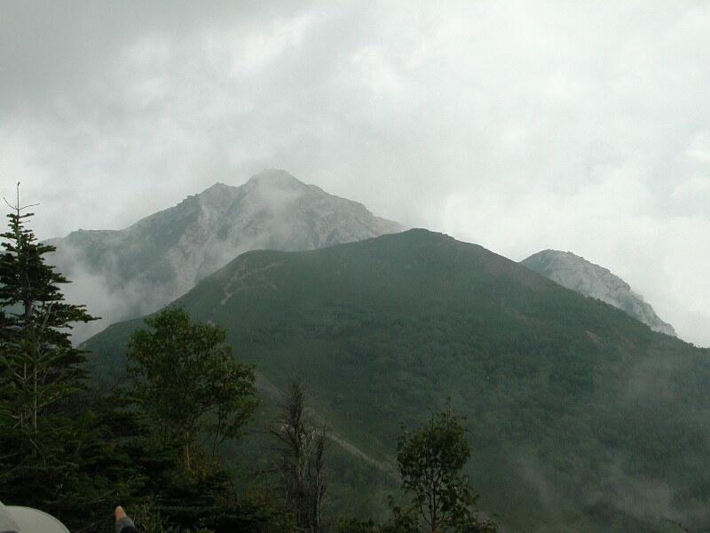 後ろは千丈岳。微妙に重なっているが手前が小千丈岳(2,855m)、奥が千丈岳(3,033m)。翌日登る予定だったが、中止した。後ろは甲斐駒ケ岳山頂(2,967m)