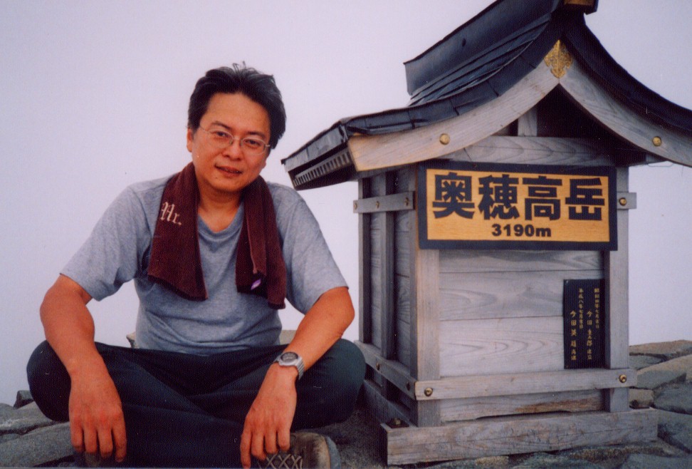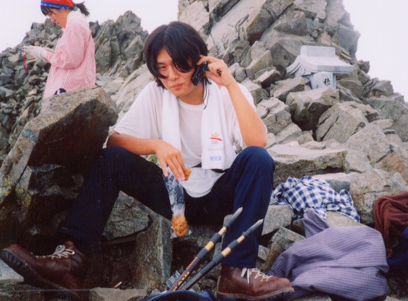 奥穂高岳山頂にて。右の写真は携帯電話使用中。2000.8.8撮影