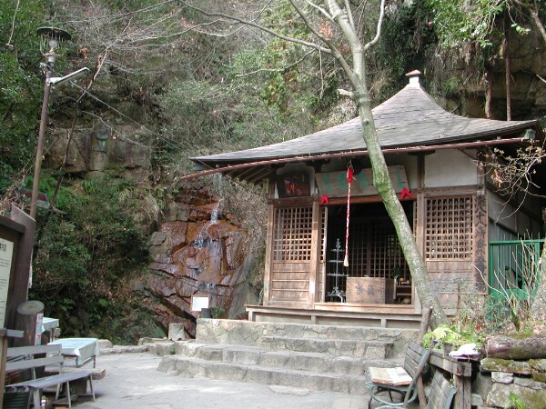 六甲山ハイキング 2002.2.10撮影 左が高座の滝。手前には売店がある。 ここの直前までは車が入る。滝の前を 左折するといきなり岩の狭い道になる。 高座の滝。小さな滝である。
