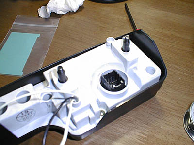 白いメーターケースの底に空いている小さな穴をドリルで揉んで丸穴にして、底から配線を引っ張り出します。3本の線のうち、2本はEL板の端子につながっており、残りの黒いリード線は基板裏の適当なグランドパターンにはんだ付けします。。この黒いリードは、ドライブモジュールのコモン(GND)に接続するためのものです。別に、基盤裏のパターンから引っ張り出さなくても、車体の金属部分ならどこでも良いのだけれど、こうしたほうが配線がすっきりまとめられそうだったのでそうしたのです。