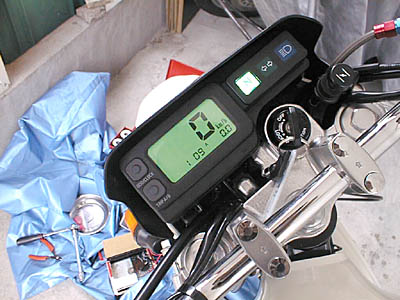 ELバックライトにしてから気がついたのですが、液晶パネルの左端には、燃料マークとバーグラフ用のパターンがうっすらと見えます。燃料残量表示も用意されている液晶パネルのようですが、シェルパのタンクには残量センサーがついていないので残念ながら簡単には残量表示はできそうにないです。できれば、簡易タコメータ表示にでもすると良いかもしれませんね。レッドゾーンがわかる程度の表示しかできそうにないですが・・・