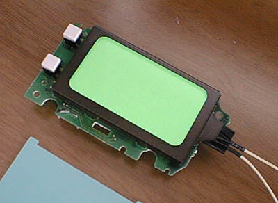 EL板を液晶パネルとアクリル板との間にはさみ(発光面はもちろん液晶に接する方)基盤を元通りに組み立てます。ドライブモジュールにリードを接続し、電源(006P電池)も正しく接続してちゃんと発光するかどうかチェックしてみます。メーター基盤に電源をつないでいないため、文字が表示されません。したがって文字のコントラスト等は判らないですが、とりあえず良い感じで光っているのでひと安心。チェックがすんだらメーターケースにネジ止め(2本)します。