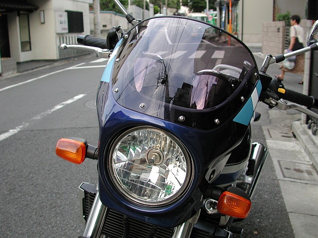 担当者に電話すると、現在猛烈に忙しく、GSXの青/白のツートンカラー対応はできないとのこと。いろいろ考えたが、青のみでも充分イカしてると判断し、「ロードコメット」のスモークスクリーン仕様、純正色の青塗装で注文する。ほんとに忙しいらしく、納入まで一月かかると言われ、気長に待つことにする。